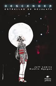 Descender es el título de una nueva y original saga de ciencia ficción dirigida a los jóvenes que toma la forma de una novela gráfica. Los autores, Jeff Lemire y Dustin Nguyen, han conseguido darle un nuevo giro a las constantes de este género, sin renunciar a algunos de los temas centrales de la narrativa fantacientífica. El primer libro de la serie se llama Estrellas de hojalata y narra la historia de Tim, un androide con aspecto de niño que despierta en una colonia minera situada en el planeta Dirishu 6. Tim ha permanecido una década desconectado y cuando vuelve a activarse se encuentra con que todos los habitantes del lugar han muerto tiempo atrás. ¿Qué ocurrió mientras él dormía? ¿Por qué no hay nadie? Sus indagaciones lo llevan a descubrir que una terrible masacre ha diezmado a los seres humanos.